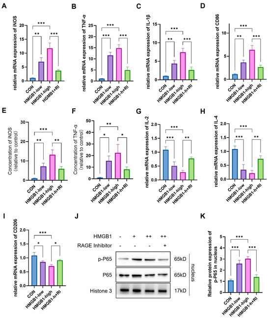 We further applied the RAGE-specific antagonist FPS-ZM1 to investigate whether HMGB1-triggered microglial polarization toward a pro-inflammatory phenotype is mediated through RAGE. The experimental data showed that the RAGE inhibitor significantly reversed the changes in mRNA levels of pro-inflammatory and anti-inflammatory markers induced by HMGB1. Specifically, RAGE inhibitor treatment significantly reduced the mRNA expression levels of HMGB1-induced pro-inflammatory markers (iNOS: 65%↓; TNF-α: 62%↓; IL-1β: 68%↓; CD86: 45%↓; p < 0.001) (Figure 6A–F) while upregulating the mRNA expression levels of anti-inflammatory markers (IL-2: 2.1-fold↑ vs. HMGB1; IL-4: 2.9-fold↑, p < 0.001; CD206: 1.2-fold↑, p < 0.05;) (Figure 6G–I). Additionally, WB data further confirmed that the RAGE inhibitor could significantly reduce the nuclear expression levels of the downstream molecule p-p65 of RAGE by ~65% (p < 0.001; vs. HMGB1) induced by HMGB1 (Figure 6J,K). These results indicate that the RAGE inhibitor effectively reversed HMGB1-triggered microglial polarization toward a pro-inflammatory phenotype by inhibiting RAGE and its downstream signaling pathway.
