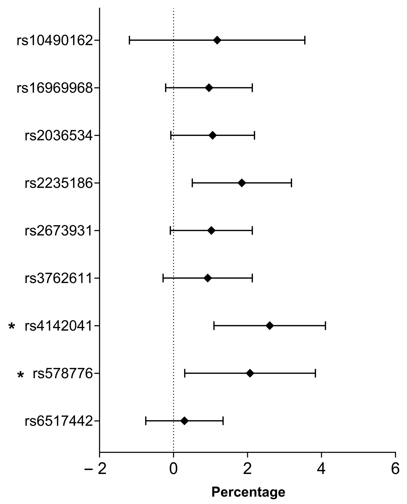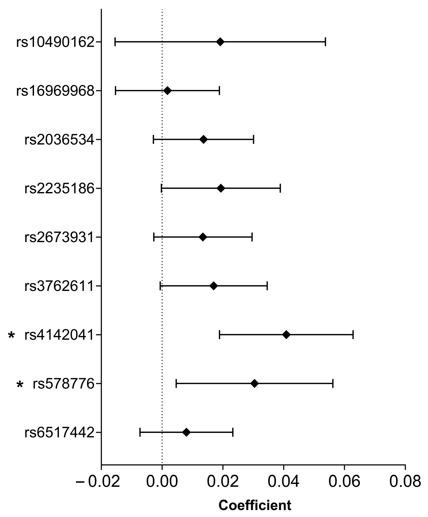 rs4142041 (A) | Recessive | 0.497 (−1.410–2.404) | 0.609 | 0.175 |