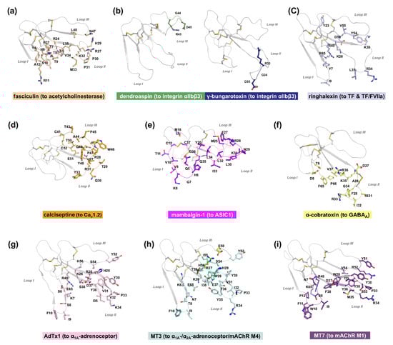 Snake venom toxins belong to a small number of superfamilies of enzymes and non-enzymatic proteins. One of the well-recognized, abundant families of non-enzymatic venom proteins is that of three-finger toxins (3FTxs) [1,2,3]. Members of this multigene family contain 57 to 82 amino acid residues. They have a similar compact protein folding scaffold, built by three β-stranded loops extending from a central core stabilized by four conserved disulfide bridges, resulting in an uncanny resemblance to three fingers stretched from the palm (the central core), hence the name “three-finger” toxin. 3FTxs are rich in disulfide bonds. In addition to the four conserved disulfide bridges in the central core (or palm), some 3FTx types occasionally have an extra fifth disulfide bond, located either in their central loop II (e.g., long-chain α-neurotoxins and κ-neurotoxins) or in the N-terminal loop I (e.g., non-conventional neurotoxins) [4]. Loops I and II are topologically interlocked in the central core, and the overlapped segment is described as the “head” here. Meanwhile, loop III is linked to loop II via a short segment of residues, described as the “gap” here. Interestingly, despite their common three-finger fold, these polypeptides greatly differ in their biological activities [1,2,3]. Their diverse biological activities involve selective interactions with a wide array of receptors and ion channels (Figure 1). For example, neurotoxins antagonize nicotinic acetylcholine receptors (nAChRs) [5]; aminergic or muscarinic toxins interact with biogenic amine receptors and muscarinic acetylcholine receptors (mAChRs) [6,7,8,9,10]; calciseptine interact with Ca2+ channels [11,12]; mambalgins block acid-sensing ion channels [13,14]; and micrurotoxin and α-cobratoxin interact with gamma-aminobutyric acid type A (GABAA) receptors [12,15]. Other selective interactions include dendroaspin and γ-bungarotoxin interacting with integrins [16,17,18], hemextin and ringhalexin inhibiting factor VIIa [19,20], and fasciculin inhibiting acetylcholinesterases [21,22]. In addition to these selective activities, some 3FTxs exhibit non-selective interaction-mediated cell lysis. For example, cardiotoxins or cytotoxins interact with phospholipids and cell membranes [23]. In addition, novel and unexpected biological activities are seen in some 3FTxs, such as cardiotoxin-I interaction with interleukin or insulin receptors [24] and the 3FTx-activated motility of sperm exhibited by actiflagelin [25].