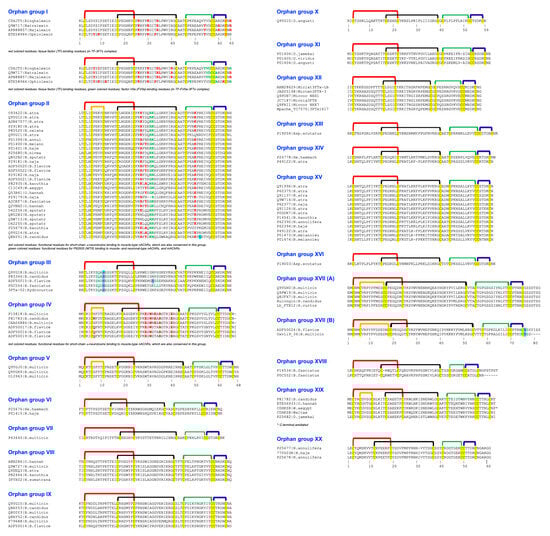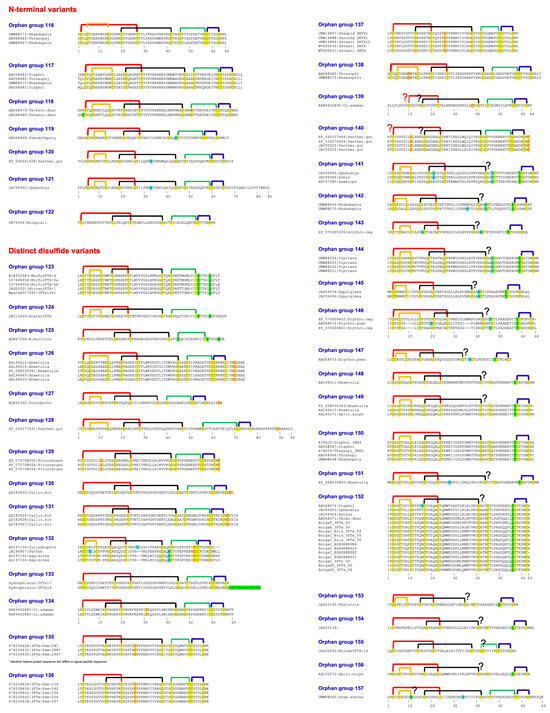 In this fast-growing 3FTx family, there are numerous toxins whose functions are not yet determined. In 2003, we performed phylogenetic analysis of 3FTxs and described the diversity of family members [2]. A significant proportion of these 3FTxs belonged to clades with unknown functions. Therefore, these 3FTxs were grouped into 20 different orphan clades (I–XX) with individual toxins showing 75% sequence similarity. In the last two decades, we and others have characterized the structure and/or functional properties of ten of these orphan clades (Table 1). We also added several new members to the previously identified clades. Since then, sequences of a large number of 3FTxs have been determined by high-throughput transcriptomics and proteomics. Currently, more than 1700 amino acid sequences of snake venom 3FTxs are deposited in various free-access databases (e.g., UniProt and NCBI) and new members are constantly being added. Based on the sequence analyses, we classified all potential neurotoxins (for details, see ref. [36]). However, no unified update has integrated the post-omics explosion of sequences with a systematic reclassification of the remaining uncharacterized 3FTxs. By preliminary sequence analyses, we identified over 550 3FTxs whose functions have not yet been determined. In this review, we briefly summarize the data obtained for orphan 3FTxs during the last two decades. We have classified the newly discovered 3FTxs and updated the groups of orphan toxins to 157 different clades based on their sequence similarity. We also codify structural features of 3FTxs such as N-terminal and C-terminal length, loop sizes, and interloop connectivity into coherent architectural categories. We anticipate that this updated and consolidated “orphan 3FTx toolkit” will be useful in providing a clearer picture of the unexplored library of novel biological ligands with potential new structures and functions.