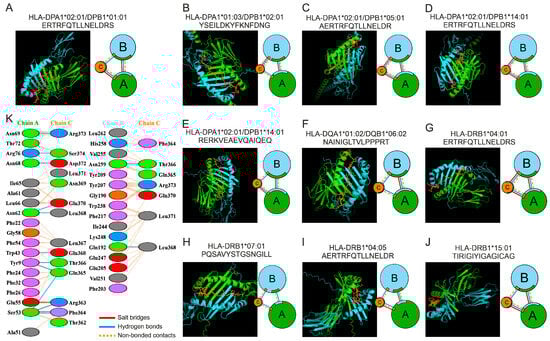 (A–J) The binding interface between HTL epitopes and HLA class II molecules. Visualization of the molecular docking results was achieved with PyMOL 3.1.3. The protein–protein interface between (A,B) (HLA) chains and the (C) (HTL epitope) chain exhibits interacting amino acid residues, as shown by PDBsum data. The area of each circle is directly proportional to the surface area of the associated protein chain. The extent of the interface region on each chain is represented by the black wedge, whose size signifies the interface surface area. (K) The amino acids involved in intermolecular contact formation of HLA-DPA1*02:01/DPB1*01:01 and the HTL epitope ERTRFQTLLNELDRS are listed as examples. Colored lines, each representing a unique interaction, connect interacting amino acids.