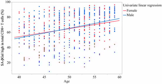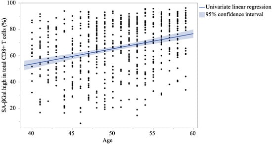 Table 4 presents the results of the linear regression analysis with each CD8+ T cell as the response variable and age as an explanatory variable. The multivariate analyses were adjusted for sex and BMI. Similar to univariate analysis, the multivariate analysis demonstrated that the total CD8+ T cell and naïve CD8+ T cell levels were significantly reduced with age, whereas TCM, TEM, and TEMRA CD8+ T cell levels were significantly increased. Moreover, the proportion of SA-βGalhigh in total CD8+ T cells, and naïve, TCM, TEM, and TEMRA CD8+ T cells significantly increased with age. Figure 1 and Figure 2 showed linear univariate regression analyses of the correlation between the proportion of SA-βGalhigh in total CD8+ T cells and age. Figure S2 showed linear univariate regression analyses of the correlation between the proportion of SA-βGalhigh in each CD8+ T cell subset and age. On the other hand, no significant regression coefficient was observed between the proportion of SA-βGalhigh in total CD4+ T cells and age (β = 0.245; 95%CI = −0.021 to 0.511; p = 0.071 and β = 0.245; 95%CI = −0.02 to 0.51; p = 0.07, for univariate and multivariate, respectively).