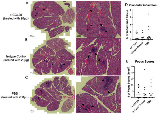 α-CCL25 treatment does not significantly alter lymphocytic infiltration in salivary glands. Representative H&E-stained submandibular salivary gland sections from mice treated with (A) α-CCL25 (20 μg), (B) isotype control (20 μg), or (C) PBS (200 μL). Black arrowheads indicate lymphocytic foci. Scale bars = 800 μm (left panels) and 200 μm (right panels). Right: Quantification of salivary gland inflammation using two measures (D) percentage of total tissue area occupied by inflammatory infiltrates, and (E) focus scores, defined as the number of lymphocytic foci per 4 mm2 of glandular tissue. Kruskal–Wallis analysis of inflammation percentage showed no significant differences across groups (statistic = 3.121, p = 0.2100). One-way ANOVA revealed also no significant differences in focus scores among treatment groups (F = 0.020, p = 0.980). Each point represents an individual mouse; horizontal bars indicate group medians.