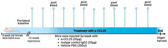 Overview of the 12-week experimental design in female NOD.H2(h4) mice beginning at 8 weeks of age. This schematic illustrates the experimental timeline and treatment groups. Mice received a baseline pre-bleed prior to treatment initiation, followed by intraperitoneal injections three times per week for 12 weeks with either anti-CCL25 monoclonal antibody (20 µg), isotype control IgG2b (20 µg), or vehicle (200 µL PBS). Peripheral blood was collected biweekly starting at week 12, and mice were monitored throughout the study. At the end of the treatment period, saliva was collected and organs were harvested for downstream analysis. Created in BioRender (https://BioRender.com).