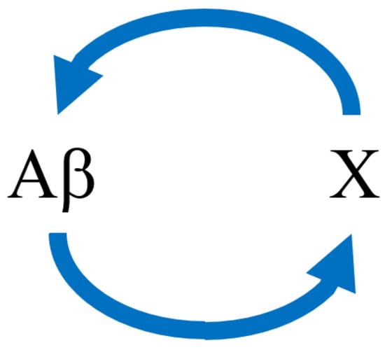 Schematic of the dual positive vicious cycle feedback model for Aβ and X. Note that the arrows represent stimulation (i.e., positive feedback) instead of chemical conversion.