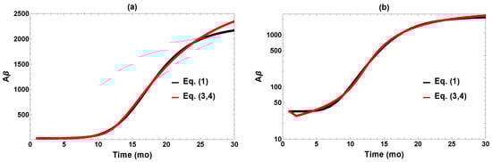 We initially were very open to the possibility that our mouse model might show behavior like the jump model of [23]. However, we have not found evidence that bistability plays such a role. The reason is that bistability requires an interaction or competition between linear and feedback processes, whereas the feedback term produced by our fitting to the mice data is massive and overwhelms the linear terms. This moves the “jump-off” bifurcation to an Aβ level far below anything relevant at any point in the mouse life trajectory. Instead, the vicious cycle gradually but inexorably moves the mouse on a lifelong path of disease. This could be called a “drift” picture, rather than a bistable “jump.” It is worth noting that we find this also in variants of our model, e.g., one in which we introduce a linear basal Aβ production term into our kinetic scheme of Equations (3) and (4). There is simply not presently a role for the jump, based on the data. The model of Ref. [23] was specifically constructed to produce a jump as proof of concept, with parameters not tied to quantitative data. It would be of great interest in the future to have data to tell if the human disease process is more like the jump idea of Ref. [23].