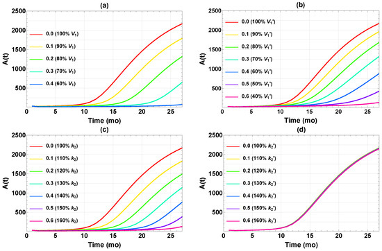Now, we discuss possible interventions implemented by changing the parameters in the model. Of the eight parameters in Table 1, and were fixed during fitting and so are not suitable candidates for intervention. Reducing these initial values would not help retard disease progression anyway, considering the massive buildup later. Overall, the accumulation of Aβ could be ameliorated by (1) increasing the parameters and/or , i.e., accelerating first-order removal of A and X, (2) reducing and/or , i.e., reducing the magnitude of feedbacks, and (3) increasing and to delay the onset time of feedback without reducing the saturation levels [31]. However, due to a lack of understanding at present of the physiological meaning of and , these two parameters are excluded from discussion from this point on. This leaves the four parameters , , , and as suitable candidates for intervention. We will first consider single interventions by varying these four parameters separately.