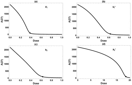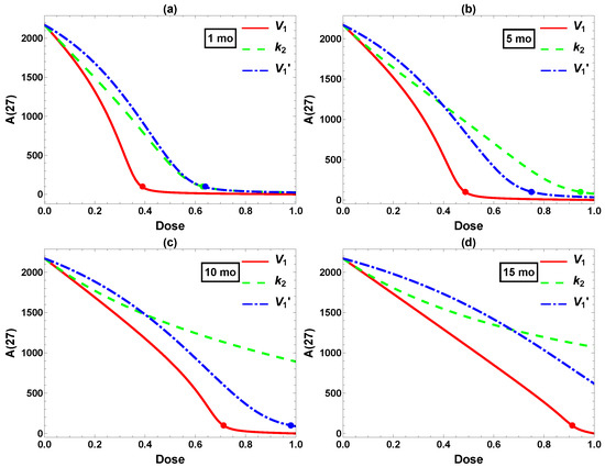 Comparison of interventions in , , and starting at (a) 1, (b) 5, (c) 10, and (d) 15 mo. x-axis: intervention dose defined in Equation (5). y-axis: Aβ level at 27 mo. The dots label the minimum dose required to attain the desired reduction 100.