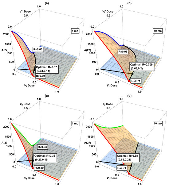 In Table 2, we combined two interventions at the same strength. However, the doses of individual drugs in actual combinational therapy should be adjusted according to their efficacy and toxicity. Hence, we have further considered two interventions in all possible dose combinations. The results are displayed as 3D plots in Figure 6. Intersections of the 3D surface with the side walls in the plot correspond to single interventions (, , or ). The black curve in each panel is the intersection in the horizontal plane of the dose–response surface (orange) and the desired threshold (light blue). The shortest Cartesian distance R between this curve and the origin, indicated by the black line segment from the origin to the black dot, might be taken as the optimal combination. While certainly being somewhat arbitrary, this definition of the optimal dose seems not unreasonable. For present purposes the exact definition should not alter the qualitative conclusions we will present below. (In considering optimality, we ignore the issue of drug toxicity due to the highly abstract nature of our model, although it would be very important when actual drugs are considered.) Among these six plots, the optimal combination generally does not align along the diagonal (i.e., combining two interventions at the same dose, as considered in Table 2), highlighting the need to refine dose combinations.