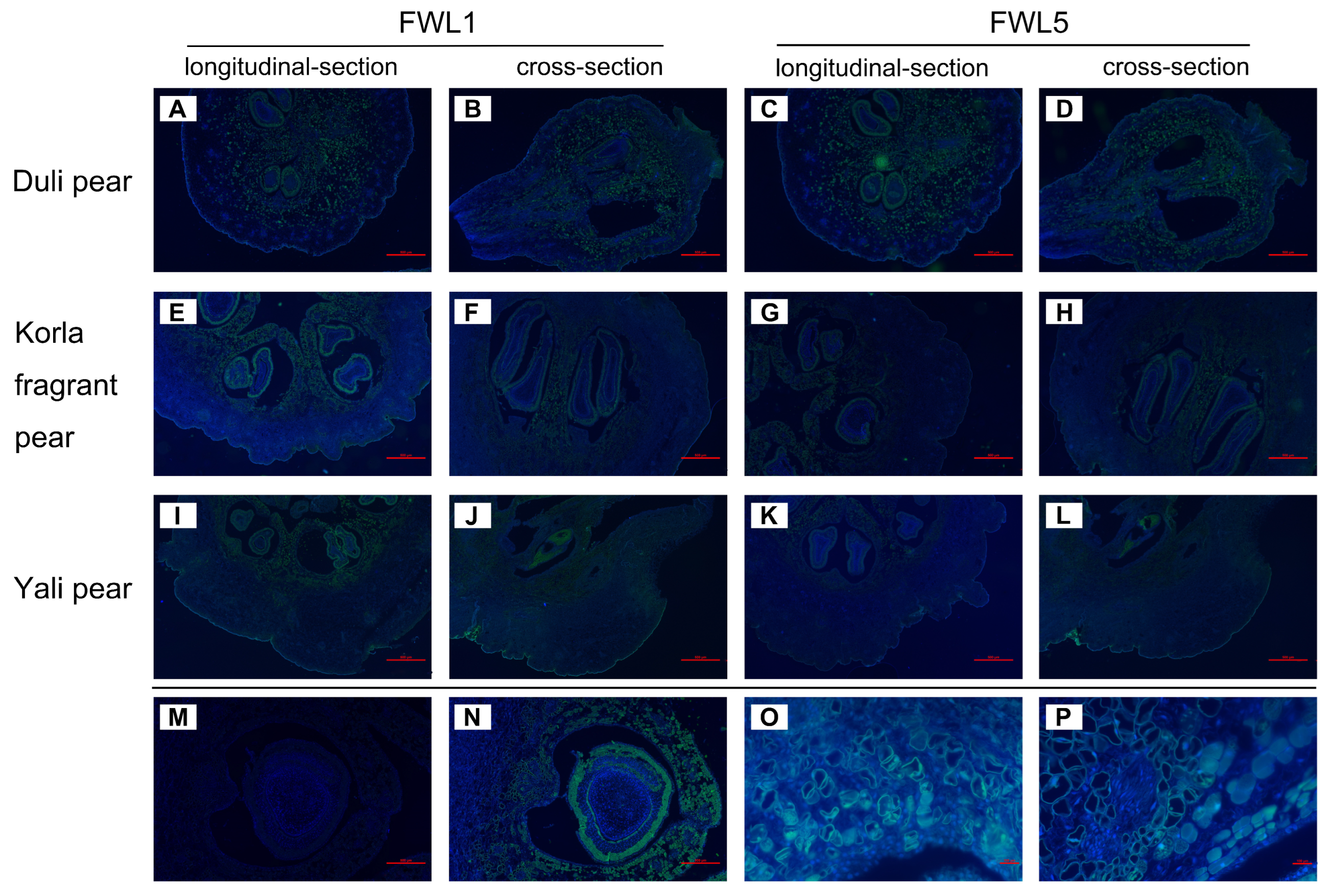 Figure 1. Results of in situ hybridization of FWLs in pear pulp at 10 DAFB. The notations (AD) correspond to the Duli pear, (EH) correspond to the Korla fragrant pear, and (IL) correspond to the Yali pear. Specifically, (A,E,I) represent the hybridization results of the FWL1 antisense probe applied to the longitudinal sections of the respective fruits. In contrast, (B,F,J) illustrate the hybridization results of the FWL1 antisense probe on the cross-sections of the same fruits. Additionally, (C,G,K) reflect the hybridization results of the FWL5 antisense probe on the longitudinal sections for Duli pear, Korla fragrant pear, and Yali pear, respectively. (D,H,L) showcase the hybridization results of the FWL5 antisense probe on the cross-sections of these fruits. (M) denotes the hybridization results of the sense probe, while (N) represents the results of the antisense probe. Lastly, (O,P) depict the hybridization results of the antisense probe observed under a 40× microscope. All samples are at 10 DAFB. The scale bars for (AN) represent 500 µm, while for (O,P), the scale bars denote 100 µm.