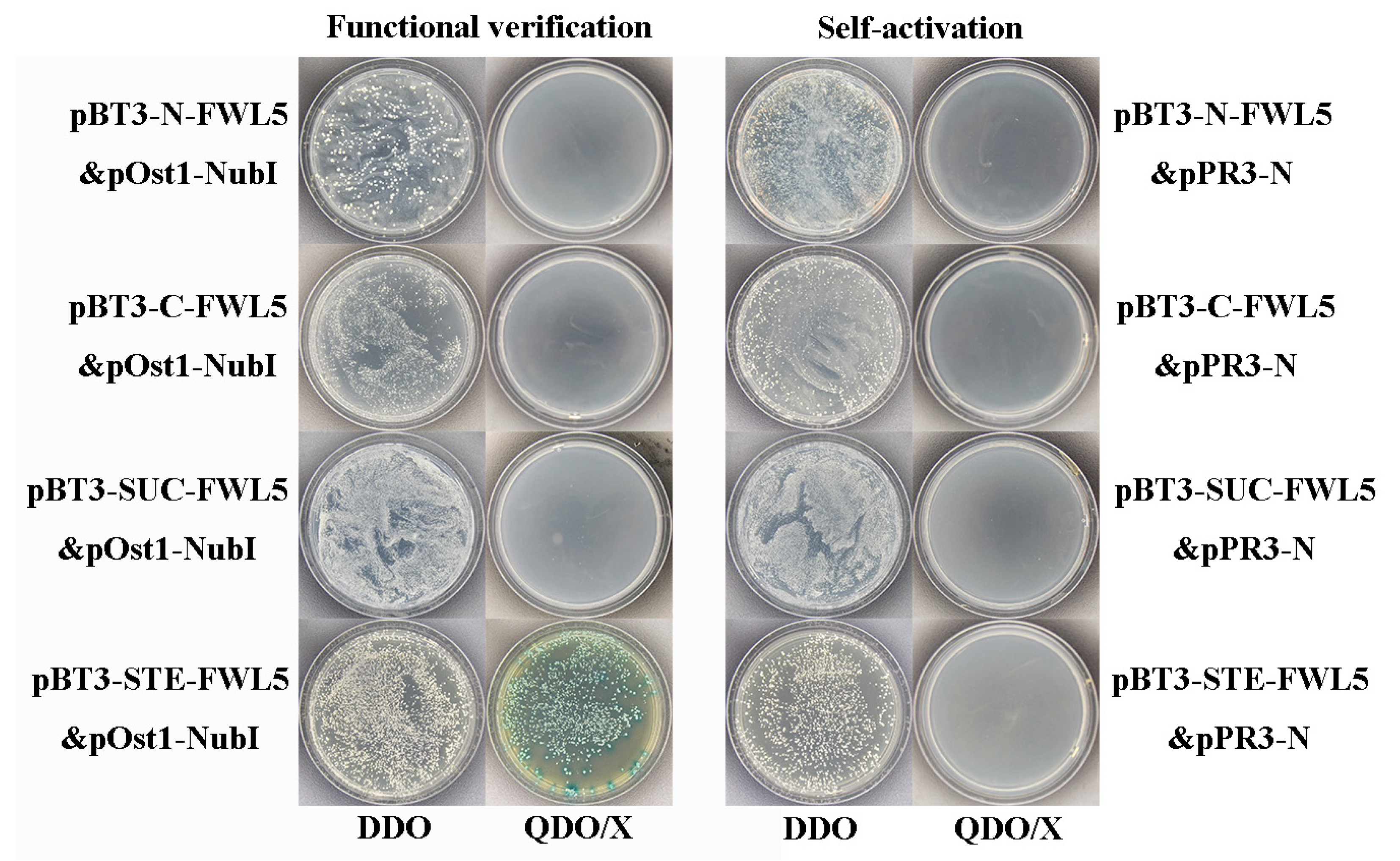To assess the functionality of the bait protein in yeast, four distinct functional verification combinations were co-transformed into the NMY51 strain of yeast. The results indicated that combinations pBT3-N-FWL5&pOst1-NubI, pBT3-C-FWL5&pOst1-NubI, and pBT3-SUC-FWL5&pOst1-NubI exhibited normal growth on DDO (SD-Leu-Trp) medium; however, they failed to grow on QDO/X (SD/-Leu/-Trp/-His/-Ade/X-a-ga) medium. In contrast, the combination pBT3-STE-FWL5&pOst1-NubI not only grew on DDO (SD-Leu-Trp) medium but also demonstrated growth and blue coloration on QDO/X (SD/-Leu/-Trp/-His/-Ade/X-a-ga) medium. This observation indicates that pBT3-STE-FWL5 effectively expresses the fusion protein in yeast and activates the downstream reporter gene. All four combinations used for auto-activation detection grew successfully on the DDO (SD-Leu-Trp) medium, confirming the success of the co-transformation process. However, their limited growth on QDO/X (SD/-Leu/-Trp/-His/-Ade/X-a-ga) selective medium suggests a low level of auto-activation activity and minimal interaction between the bait protein and the empty library plasmid (Figure 5).