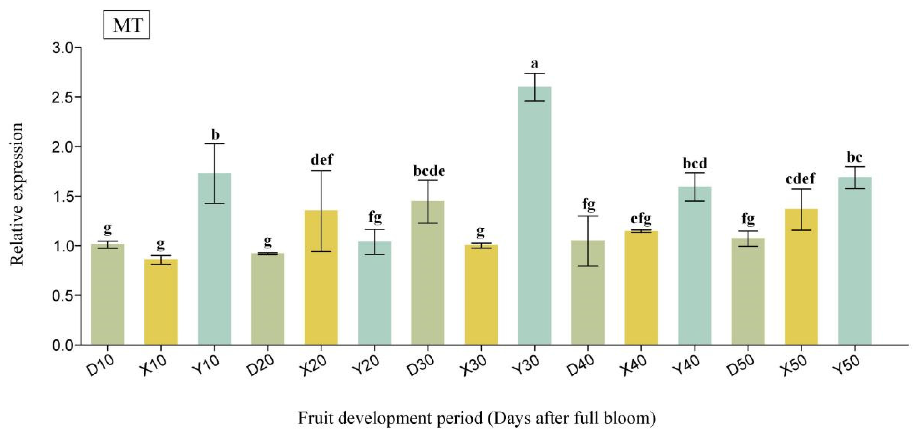 Figure 6. The qRT-PCR analysis of MT at the critical stage of cell division in pear fruit. The horizontal axis represents different pear cultivars and DAFB. “D” stands for Duli pear, “X” for Korla fragrant pear, and “Y” for Yali pear. The numbers 10–50 indicate 10–50 DAFB. Different lowercase letters (a, b, c, d, e, f, g) indicate significant differences at p < 0.05.