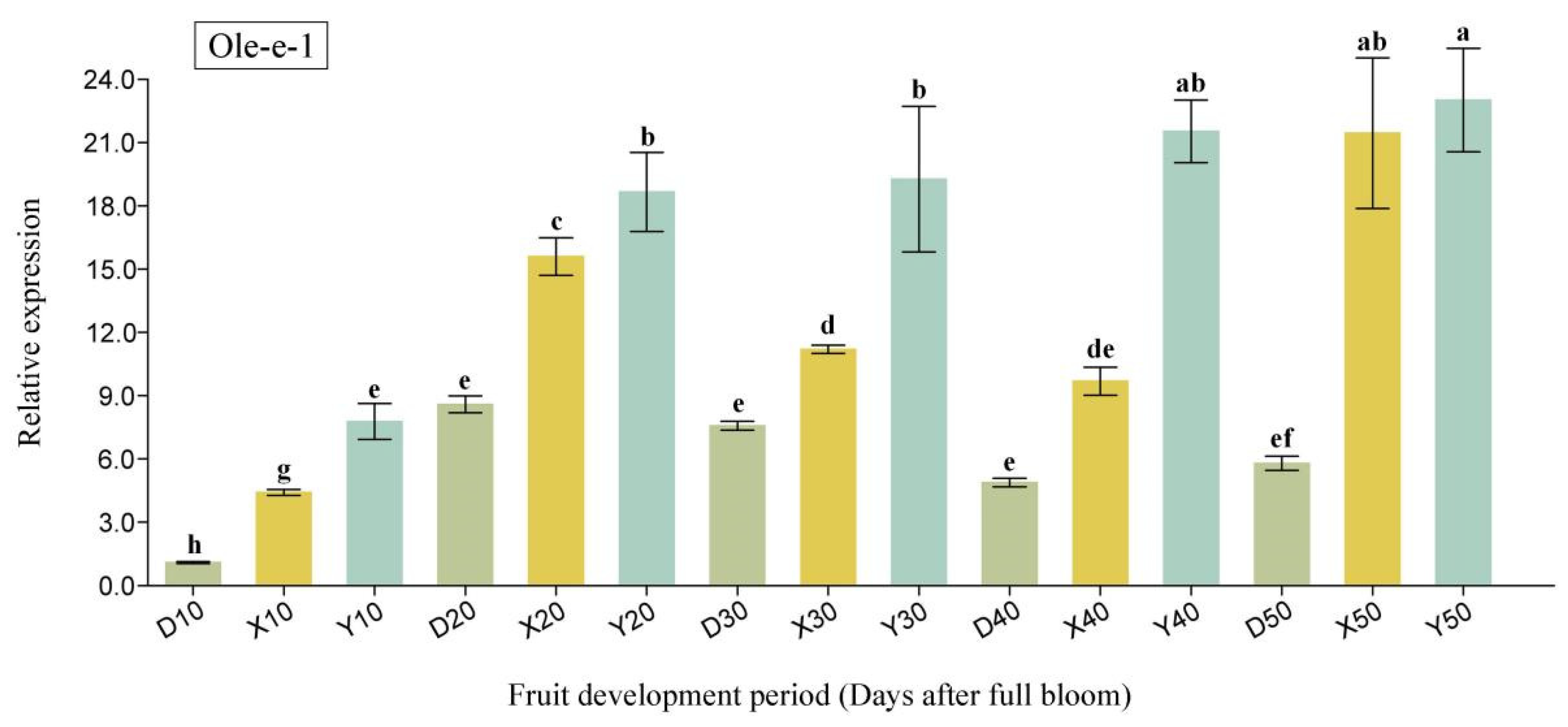 Figure 7. The qRT-PCR analysis of Ole-e-1 at the critical stage of cell division in pear fruit. The horizontal axis represents different pear cultivars and DAFB. “D” stands for Duli pear, “X” for Korla fragrant pear, and “Y” for Yali pear. The numbers 10–50 indicate 10–50 DAFB. Different lowercase letters (a, b, c, d, e, f, g, h) indicate significant differences at p < 0.05.