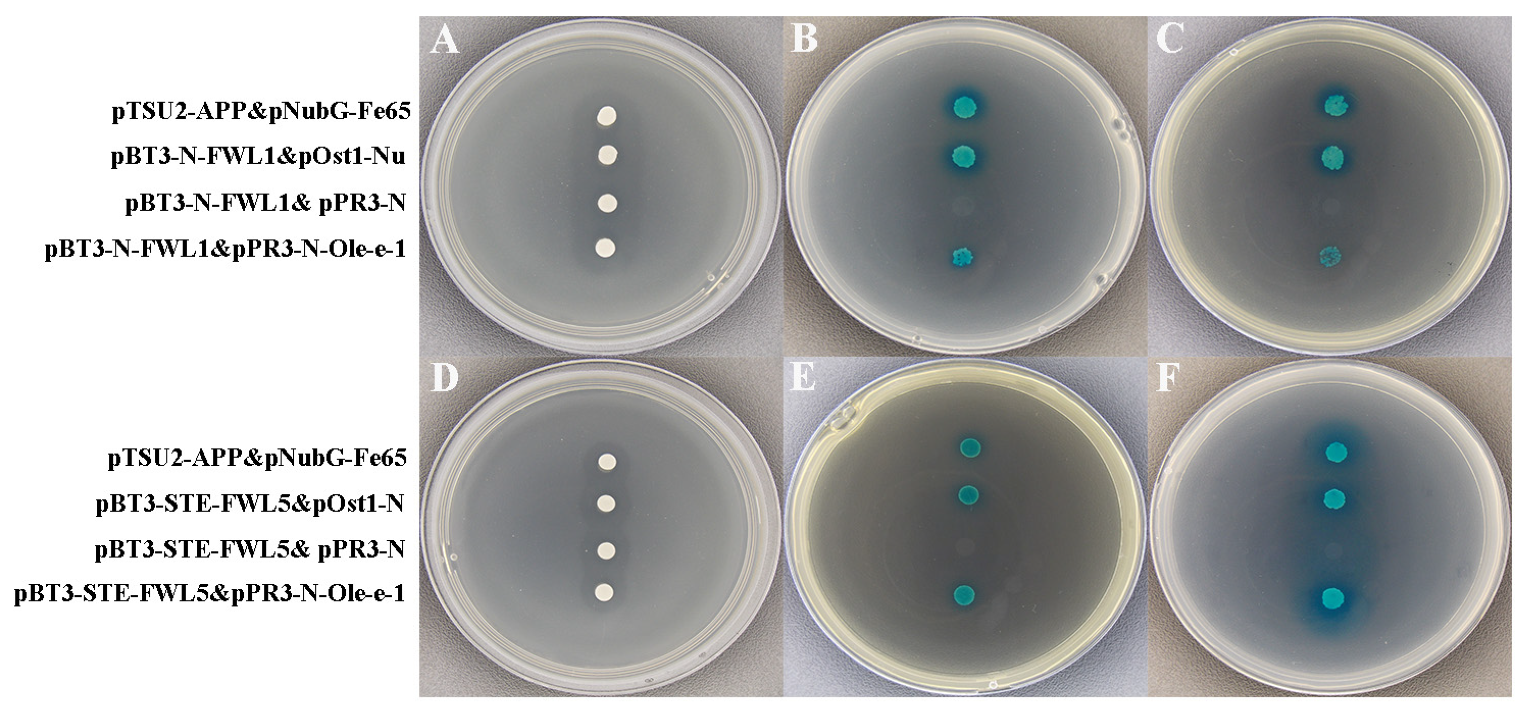 The pBT3-N-FWL vector was generated through homologous recombination. Subsequently, the pBT3-N-FWL and pPR3-N-Ole-e-1 constructs were co-transformed into yeast receptor cells for validation of interactions. In contrast, the negative controls (pBT3-N-FWL1 with pPR3-N and pBT3-STE-FWL5 with pPR3-N), tested on SD/-Trp/-Leu/-His/X-a-gal/50mM3-AT and SD/-Trp/-Leu/-His/-Ade/X-a-gal/50mM3-AT medium, exhibited no growth. Conversely, the positive controls, including pTSU2-APP&pNubG-Fe65, pBT3-N-FWL1&pOst1-NubI, pBT3-N-FWL1&pPR3-N-Ole-e-1, pBT3-STE-FWL5&pOst1-NubI, and pBT3-STE-FWL5&pPR3-N-Ole-e-1, demonstrated normal growth and turned blue. These observations indicate a potential interaction between both FWL1 and FWL5 and the Ole-e-1 proteins (Figure 8).