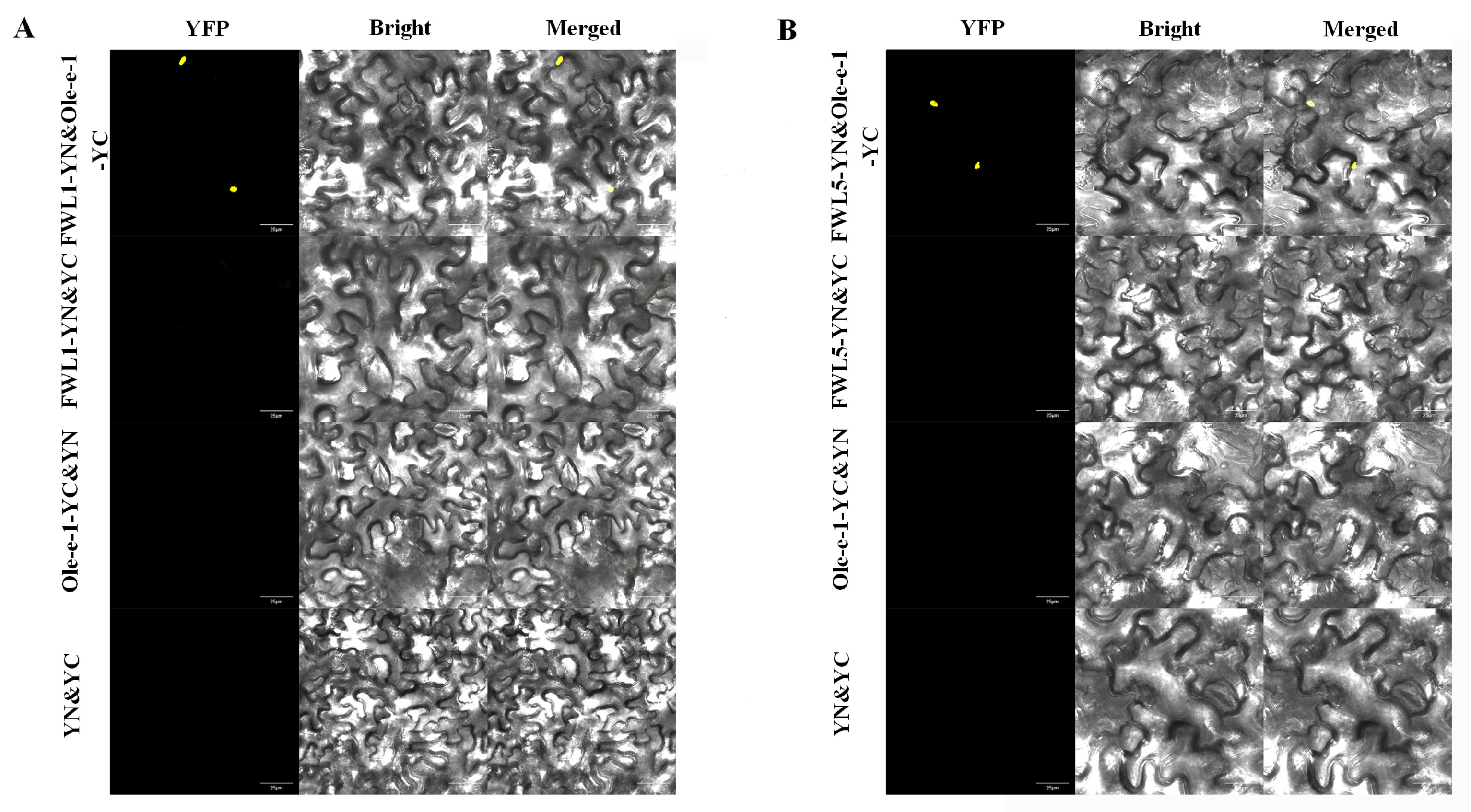 Figure 9. BIFC showed that FWL1 and FWL5 interacted with Ole_e_1 protein. (A) BIFC showed that FWL1 interacted with Ole_e_1 protein and (B) BIFC showed that FWL5 interacted with Ole_e_1 protein. YFP, yellow fluorescence channel; Bright, bright field; Merged, merged channel. The scale bar is 25 μm.