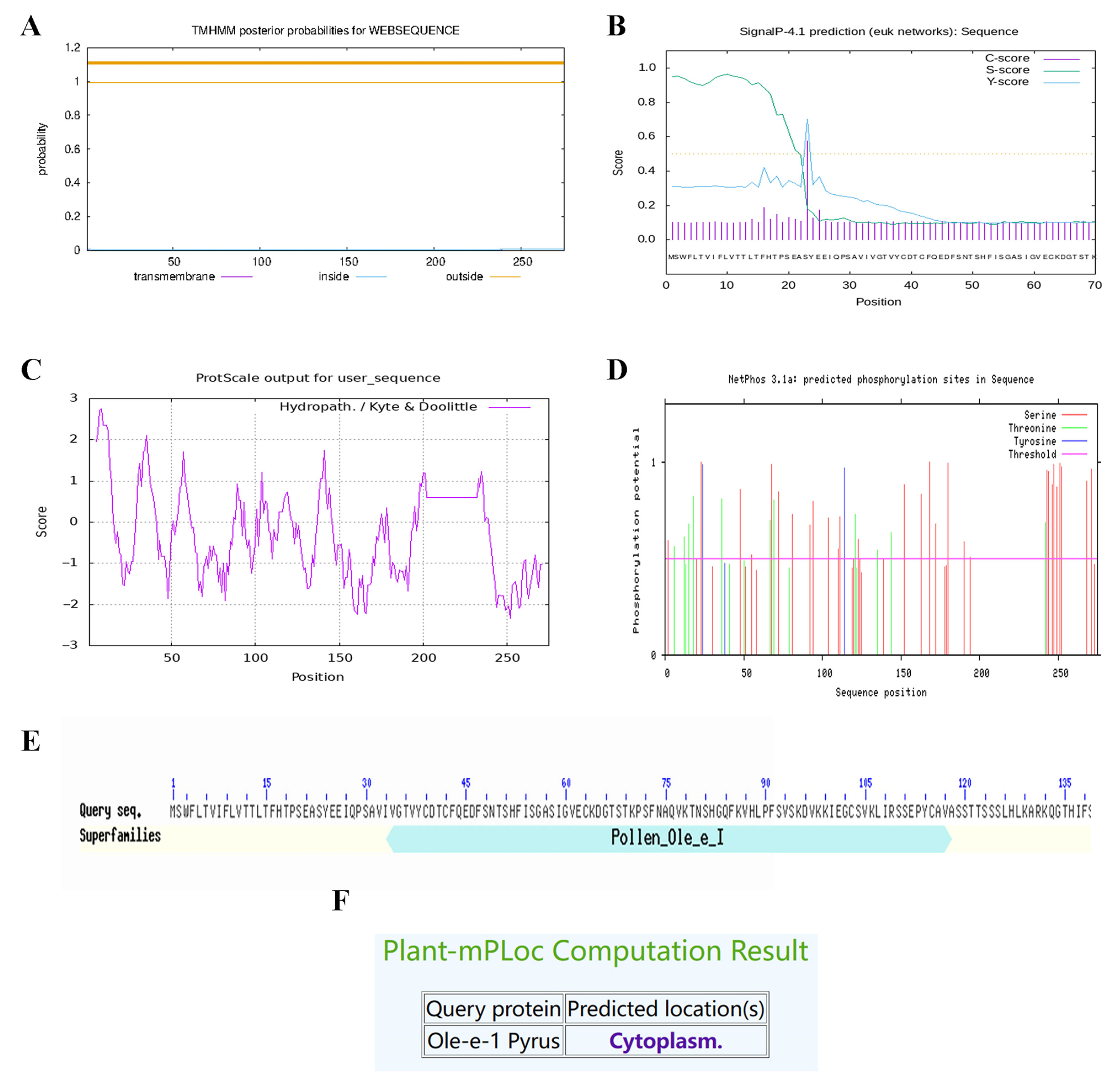 Figure 10. Bioinformatics analysis of Ole-e-1 protein. (A) Prediction of the transmembrane structure of Ole-e-1 protein. (B) Ole-e-1 protein signaling peptide prediction. (C) Hydrophobicity analysis of Ole-e-1 protein; a negative number indicates hydrophilicity, and a positive number indicates hydrophobicity. (D) Predictive analysis of Ole-e-1 protein phosphorylation sites. (E) Conserved structural domains of the Ole-e-1 protein and (F) Prediction of subcellular localization of Ole-e-1 protein.