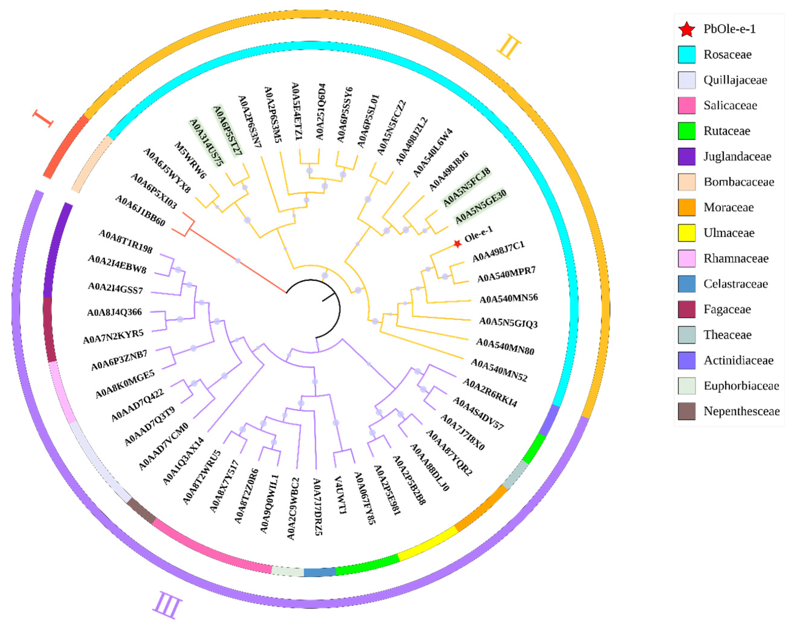 Figure 11. The phylogenetic tree for the Pyrus Ole-e-1 protein in relation to other plant Ole-e-1 proteins. The outer ring of the diagram illustrates the various subfamilies, designated as I, II, and III, while the inner ring delineates the specific family to which each protein is affiliated.
