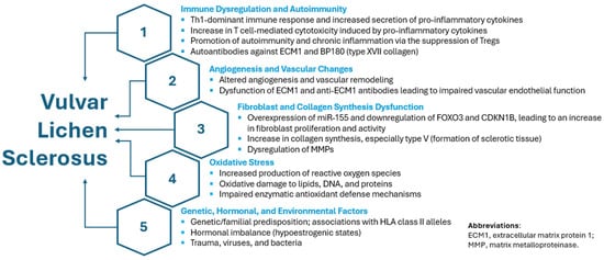 Vulvar lichen sclerosus (VLS) is a chronic inflammatory skin condition that primarily affects the genital area and may lead to sexual dysfunction [1]. Its exact cause remains unknown, and both its etiology and pathogenesis are not yet fully understood. However, there is evidence of genetic and familial predisposition [2]. Contributing factors may include repeated trauma, hormonal influences, and certain medications. VLS is considered an immune-mediated disease driven by T helper type 1 (Th1) cells and dependent on microRNA-155 (miR-155). Although autoantibodies targeting extracellular matrix protein 1 (ECM1) and BP180 have been identified in some cases, their precise role in the disease process remains uncertain. Additionally, VLS is associated with the abnormal expression of genes involved in tissue remodeling and elevated oxidative stress, both of which may contribute to scarring and an increased risk of malignancy [3,4,5].
