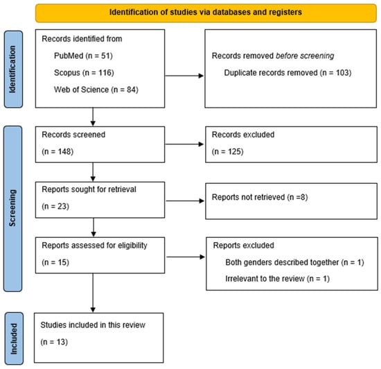 In the search, we identified 251 records (51 in PubMed; 116 in Scopus; and 84 in Web of Science). Out of these, 103 duplicate records were removed. A total of 148 titles and abstracts were screened, and out of these, 125 were excluded. Twenty-three articles were sought for retrieval and 22 were assessed for eligibility. Thirteen articles met the inclusion criteria and were summarized in this review. The selection process is presented in the PRISMA flowchart (Figure 2).