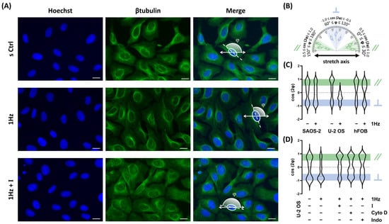 1 Hz–24 h mechanical stretch induces cell orientation in U-2 OS cells via TRPV1 activation. (A) Representative fluorescence microscopy images of U-2 OS cells stained with Hoechst (nuclei), β-tubulin (cytoskeleton), and merged channels. Images were acquired at 40× magnification. Scale bar = 25 μm. (B) Schematic representation of nuclear orientation expressed as ⟨cos 2 φ⟩. (C) Violin plots display the distribution of nuclear orientation values in SAOS-2, U-2 OS, and hFOB cells. (D) Violin plots show nuclear orientation in stretched U-2 OS cells treated with AMG (I), Cytochalasin D (Cyto D) or Indomethacin (Indo). All analyses were performed on three biological replicates, with at least 45 cells analyzed per condition.