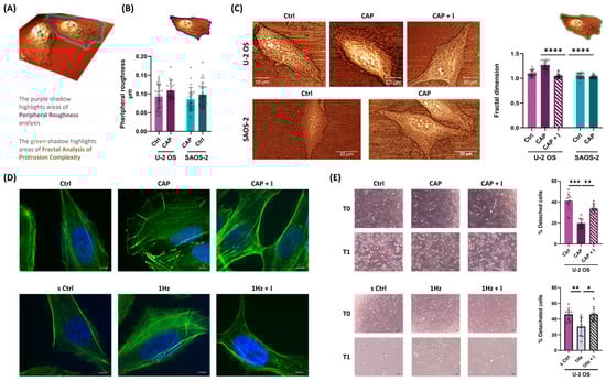 Ultrastructural analysis using AFM, and complemented by fractal dimension analysis—a powerful quantitative method previously employed to distinguish between healthy and cancerous cervical epithelial cells [60], and to evaluate the effects of actin polymerization inhibitors on cell boundary roughness in human epithelial cells [61]—revealed distinct differences in surface complexity and peripheral architecture between the two OS subtypes. Supporting these findings, immunofluorescence microscopy and detachment assays demonstrated that TRPV1 activation in U-2 OS cells promoted the formation of lamellipodia-like, actin-rich protrusions and enhanced initial adhesion, which are features associated with increased adhesion plasticity. In contrast, SAOS-2 cells exhibited minimal morphological remodeling, highlighting subtype-specific differences in mechanosensitivity, likely reflecting underlying intrinsic molecular variations [82]. Although further investigation is needed, the differing mechanosensitive responses between U-2 OS and SAOS-2 cells might be linked to intrinsic differences in cytoskeletal regulation. Specifically, changes in Rho GTPases and actin-binding protein expression or activity have been suggested to affect actin remodeling and mechanotransduction [83].