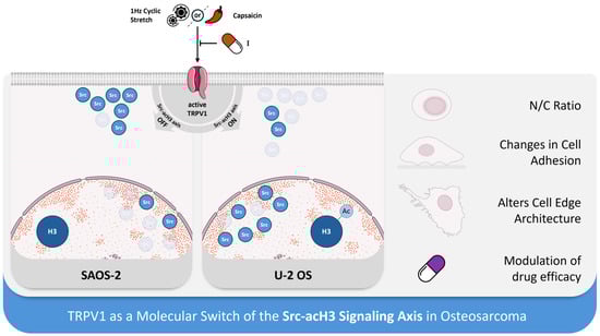 Collectively, these findings underscore TRPV1′s role as a multimodal sensor that, even in the absence of mechanical input, acts as a molecular switch to engage the Src–acH3 signaling axis. TRPV1 activation appears central to fine-tuning epigenetic regulation by modulating Src subcellular localization, thereby contributing to the phenotypic divergence observed between osteosarcoma subtypes. This cell type-specific mechanism may reflect a broader paradigm in which mechanosensitive channels integrate both mechanical and chemical cues to regulate gene expression in cancer cells. A schematic of the proposed molecular mechanism is illustrated in Figure 6.
