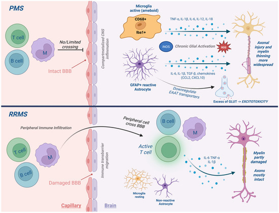 PMS is marked by a shift in the inflammatory milieu from peripheral lymphocyte-driven responses, typical of RRMS, to a more insidious form of inflammation that is compartmentalized within the CNS [23,24], while the blood–brain barrier (BBB) remains relatively preserved [25]. This ‘smoldering’ inflammation is sustained by innate immune responses, particularly involving microglia and astrocytes, which undergo phenotypic and functional changes in response to prolonged inflammatory stimuli [4,23,26].
