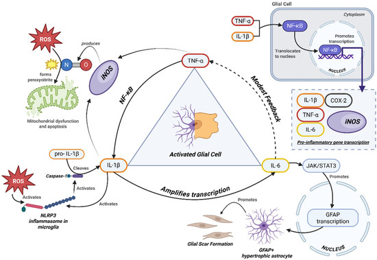 The pathological environment of progressive multiple sclerosis is shaped not by isolated cytokine actions but by a complex web of interactions between various inflammatory mediators and cellular stress pathways. This “crosstalk” forms a self-perpetuating cycle of glial activation, oxidative stress, mitochondrial dysfunction, and neurodegeneration. In this network, cytokines such as TNF-α, IL-6, and IL-1β act not merely in parallel, but in concert, synergizing through feedback loops that sustain chronic inflammation [7,23,26,28,29,30,39,45,52].