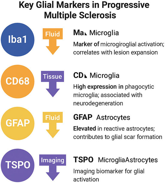 A consolidated overview of the most commonly used glial activation markers—based on cellular specificity, function, and relevance to PMS pathology—is presented in Figure 3.