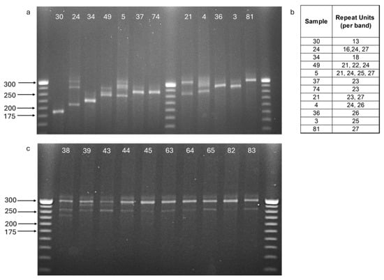 PCR amplification of the mitochondrial tandem repeat region separated on a 3% agarose gel and visualized using GelRed staining. A 25 bp DNA ladder was loaded for size calibration. (a) 12 samples (IDs above each lane) demonstrating different patterns of the mitochondrial tandem repeat region. (b) Repeat unit counts are indicated in the table. (c) 10 offspring (IDs above each lane) of the same female, demonstrating heteroplasmic patterns among siblings.