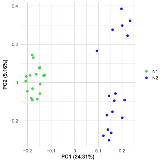Principal components analysis (PCA) based on SNP data from 34 T. triunguis individuals from two nests (N1 and N2) sampled in Hula Nature reserve in Israel.