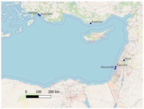 Map of the eastern Mediterranean Basin showing all sampling sites in Türkiye (Anamur River, Dalyan Strait, and Dalaman River) and Israel (Hula Nature Reserve, Taninim River and Alexander River) used in this study.