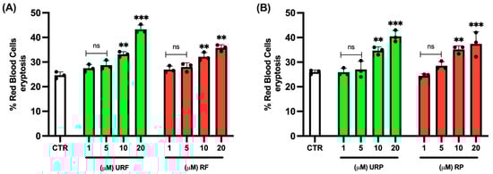 After incubation under the respective experimental conditions, RBCs (1 × 106 per condition) were resuspended in 600 μL of 1 × binding buffer and incubated in the dark for 15 min at room temperature with 5 μL of Annexin V Apoptosis Detection Kit. Fluorescence assessment was performed using FACS Calibur flow cytometer and data were analyzed with FlowJo v10 software (https://www.flowjo.com/solutions/flowjo, accessed on 25 May 2025).