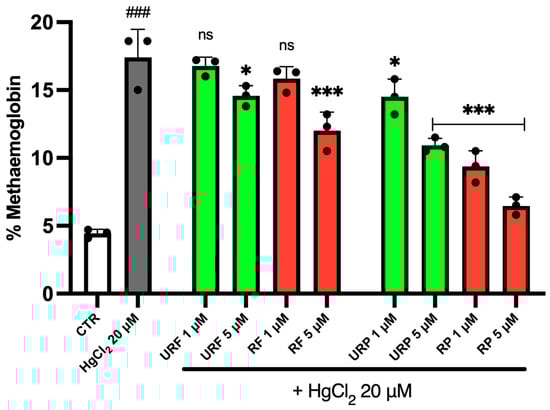 Effect of HgCl2 and different Annurca apple extract on RBC MetHb content. Cells were treated with HgCl2 and increasing concentrations of URF, RF, URP and RP. Data are the means ± SD (n = 3). Statistical analysis was performed with one-way ANOVA followed by Tukey’s test. ### (p < 0.001) shows a significant difference from CTR. *** (p < 0.001) and * (p < 0.05) indicate a significant difference fromHgCl2 treatment. ns shows no significant difference fromHgCl2.