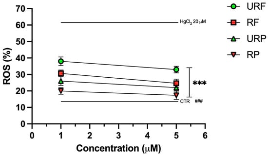 Effect of HgCl2 and different Annurca apple extract on RBC ROS generation. Cells were treated with HgCl2 and increasing concentrations of URF, RF, URP and RP. Data are the means ± SD (n = 3). Statistical analysis was performed with ANOVA followed by Tukey’s test. ### (p < 0.001) indicates a significant difference from CTR. *** (p < 0.001) indicates a significant difference fromHgCl2 treatment.