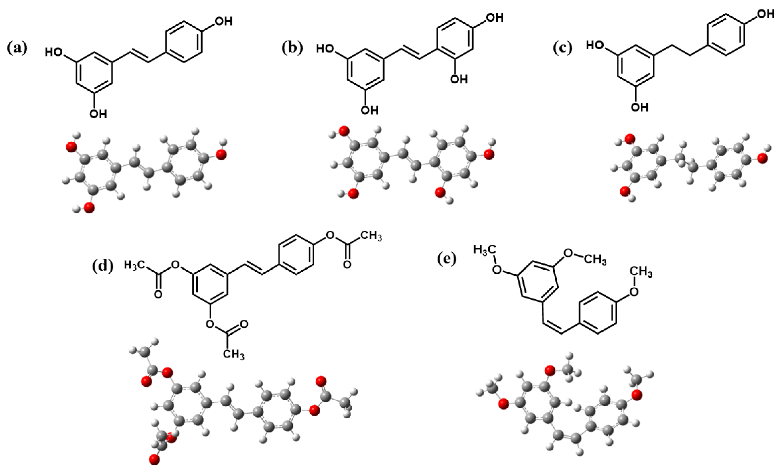 - Zeng, H.J.; Li, Q.Y.; Ma, J.; Yang, R.; Qu, L.B. A comparative study on the effects of resveratrol and oxyresveratrol against tyrosinase activity and their inhibitory mechanism. Spectrochim. Acta Part A Mol. Biomol. Spectrosc. 2021, 251, 119405. [Google Scholar] [CrossRef]
