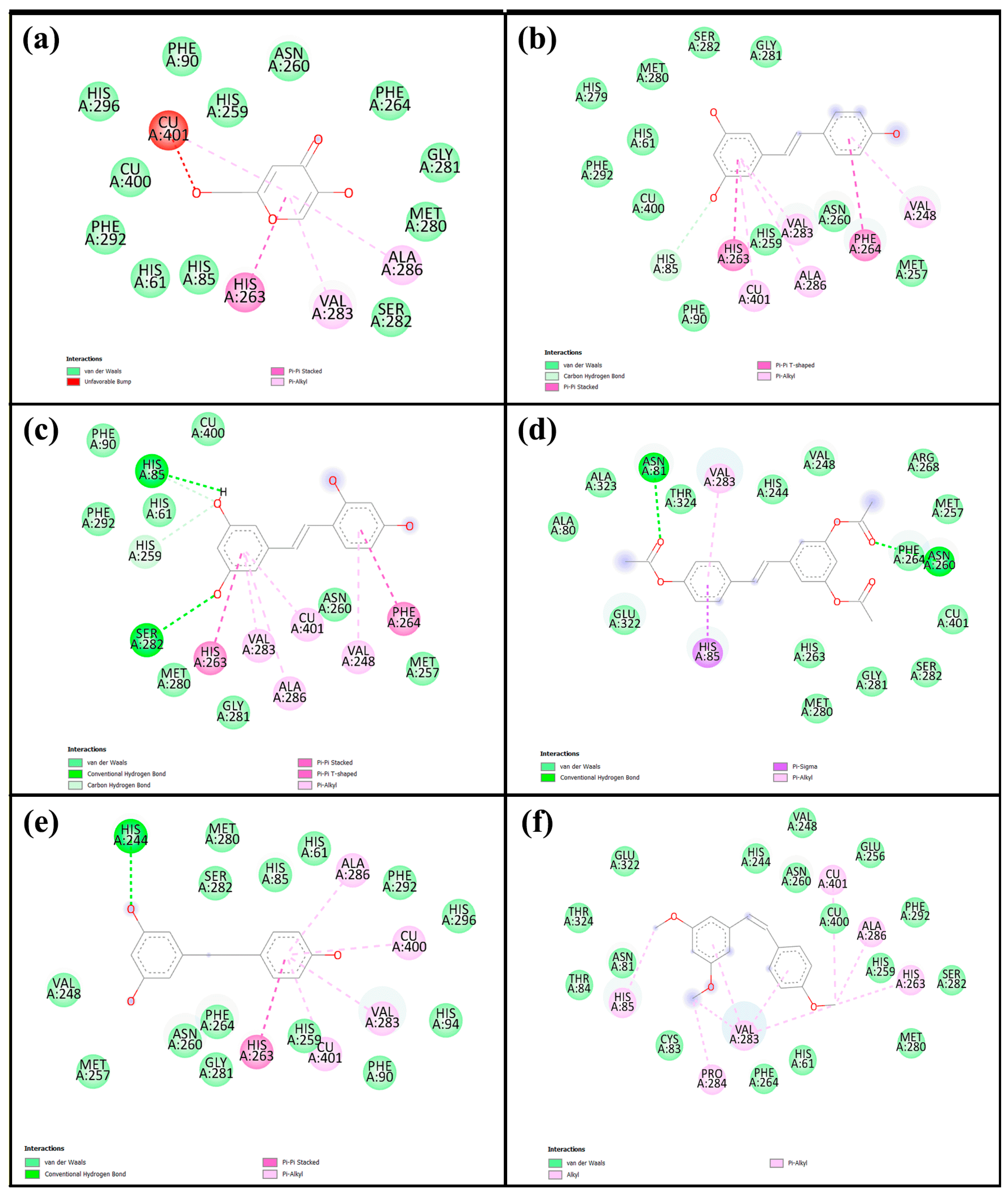 Kojic acid | −5.6 | Van der Waals: His85, His61, Phe292, Cu400, His296, Phe90, His259, Asn260, Phe264, Gly281, Met280, Ser282 Pi-Pi stacked: His263 Pi-Alkyl: Val283, Ala286, Cu401 Unfavorable bump: Cu401 | |