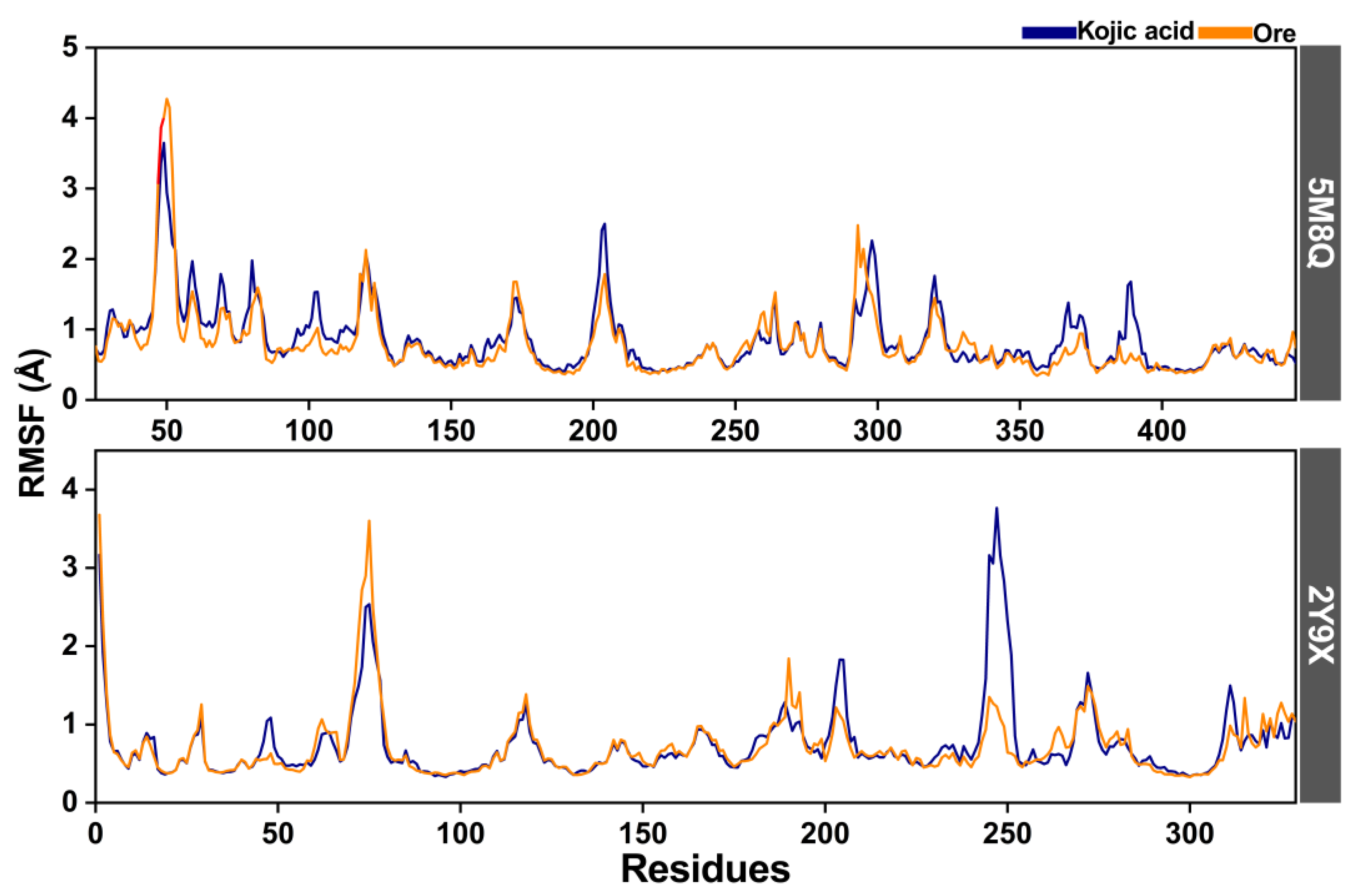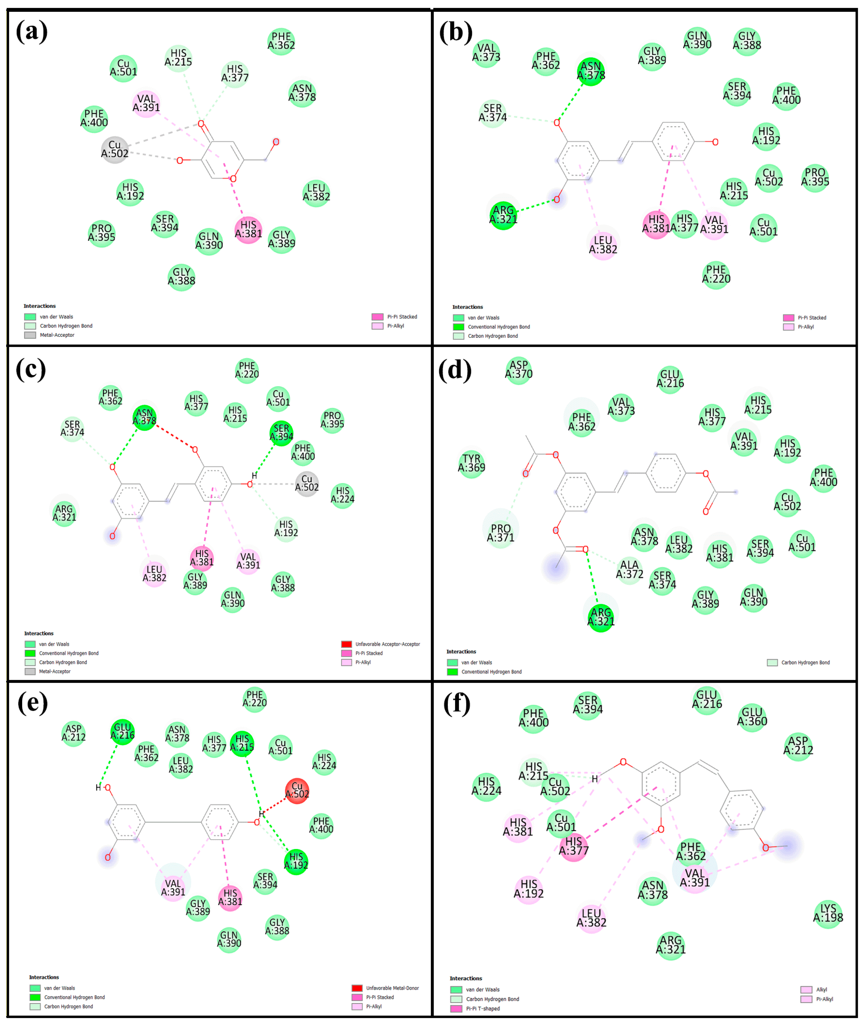 Kojic acid | −5.7 | Van der Waals: Asn378, Phe362, His377, His215, Cu501, Phe400, His192, Pro395, Ser394, Gln390, Gly388, Gly389, Leu382. Pi-Pi stacked: His381. Pi-Alkyl: Val391. Metal accepter: Cu502 |