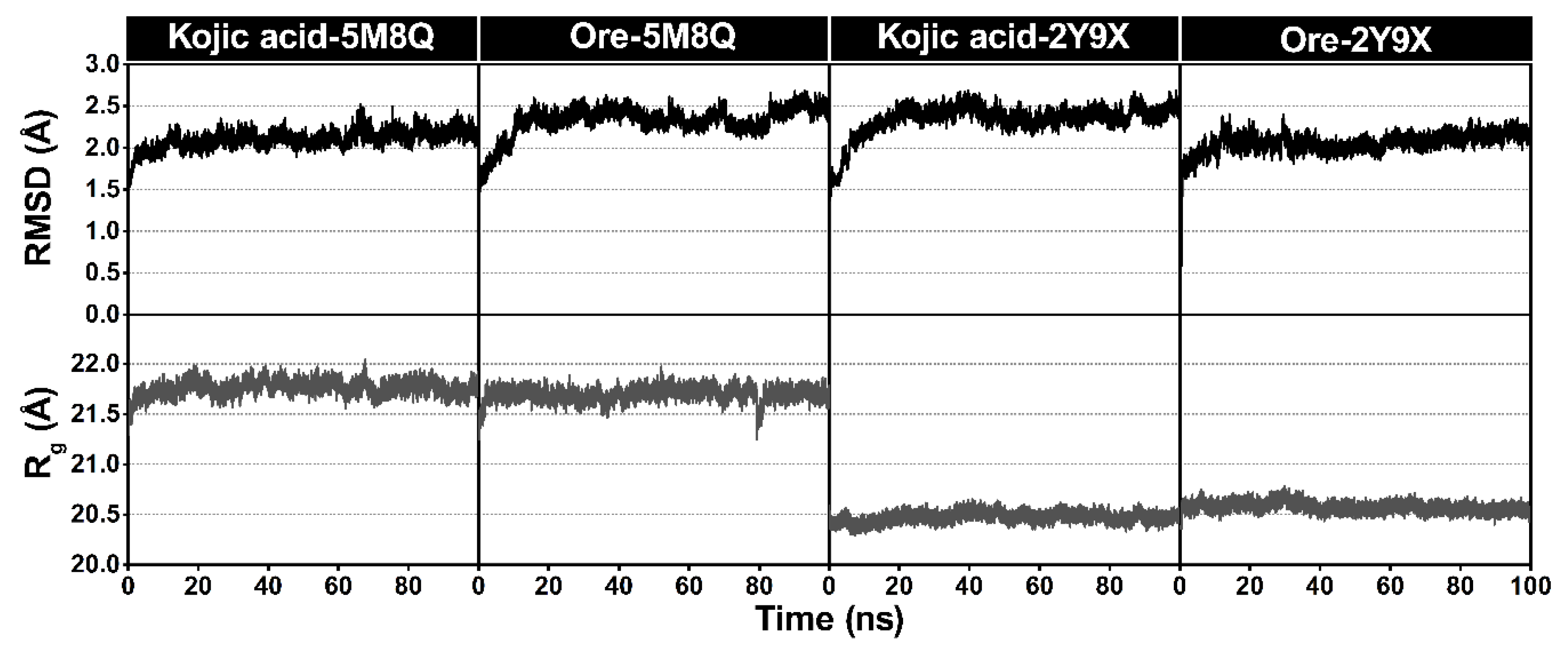 - Hassan, M.; Abbas, Q.; Ashraf, Z.; Moustafa, A.A.; Seo, S.Y. Pharmacoinformatics exploration of polyphenol oxidases leading to novel inhibitors by virtual screening and molecular dynamic simulation study. Comput. Biol. Chem. 2017, 68, 131–142. [Google Scholar] [CrossRef]