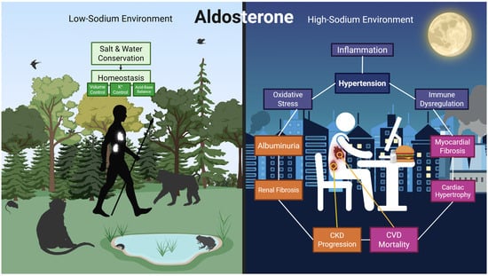 In the complex physiology of vertebrate life, the maintenance of fluid and electrolyte homeostasis is fundamental for survival []. At the core of this regulatory network is aldosterone, a mineralocorticoid steroid hormone that was first identified in the 1950s []. Aldosterone exerts its principal effects by promoting sodium and water reabsorption and facilitating the excretion of potassium and hydrogen ions, regulating blood pressure, extracellular fluid volume, and acid–base equilibrium [,]. The evolutionary emergence of aldosterone can be traced back to a gene duplication event that occurred approximately 420 million years ago in aquatic vertebrates []. In these organisms, the gene played a role in response to hypoxic stress []. The evolutionary adaptation of aldosterone for the conservation of salt and water on land was instrumental in the ecological success of tetrapods, enabling them to thrive and diversify across environments that became increasingly osmotically demanding [,]. However, in the modern era, the physiological role of aldosterone has become more problematic. A system originally shaped to preserve salt and water in environments where sodium was scarce has become maladaptive in the context of today’s sodium-rich diets []. As a result, aldosterone levels that fall within the normal range are increasingly associated with the development of hypertension and its complications, including left ventricular hypertrophy, myocardial fibrosis, heart failure with preserved ejection fraction (HFpEF), chronic kidney disease, and increased cardiovascular mortality [,,] (Figure 1).