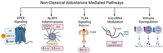 In parallel, aldosterone-induced expression of the small leucine-rich proteoglycan biglycan, released under conditions of cellular stress, serves as a potent DAMP by engaging Toll-like receptors (TLR2 and TLR4) on resident and infiltrating cells, thereby amplifying inflammatory signals via MyD88-dependent NF-κB activation and promoting recruitment of macrophages and Th1/Th17 lymphocytes, implicated in vascular remodeling and cardiac fibrosis [,,]. The transcriptional activity of the MR is finely modulated by co-regulators such as members of the SRC family and p300/CBP and is further potentiated by interactions with the glucocorticoid receptor (GR), adding another layer of tissue-specific regulation to aldosterone signaling [,]. Moreover, microRNAs such as miR-181a, miR-192, miR-802, and others regulate key elements of the RAAS and ion channel expression, with altered miRNA expression profiles implicated in the development of hypertension, heart failure, and kidney disease [,].