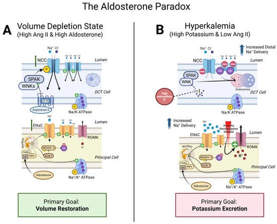 In states of volume depletion (high Ang II, high aldosterone), the primary goal is to conserve sodium and restore volume. Ang II acts as a powerful stimulator of the NCC in the DCT []. In concert, aldosterone stimulates both NCC and ENaC [,,]. In states of hyperkalemia (high K+, high aldosterone, low Ang II), the primary goal is to excrete excess potassium. Critically, high plasma K+ (and the accompanying low Ang II) inhibits the activity of NCC in the DCT []. This prevents premature sodium reabsorption, thereby ensuring robust delivery of sodium and fluid downstream. Aldosterone’s stimulation of ENaC and ROMK can now proceed with maximal efficiency []. The ample luminal sodium provides the necessary substrate for ENaC-mediated reabsorption, which in turn generates the strong lumen-negative potential required to drive vigorous potassium secretion through ROMK []. This paradoxical regulation (aldosterone paradox) demonstrates that aldosterone does not act in a vacuum. It is a DCT orchestrator that works in concert with co-signals (Ang II and K+) and modulates the responsiveness of different effectors (NCC vs. ENaC/ROMK) in different parts of the nephron []. This creates a highly sophisticated, context-dependent response that is far more nuanced than a simple, monolithic command to retain sodium and excrete potassium (Figure 4).