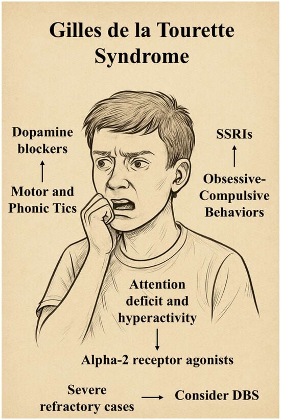 Given the heterogeneous and fluctuating nature of symptoms due to the interplay of multiple neurobiological systems, the neuropsychopharmacological treatment of GTS remains a challenge. This narrative review focuses on the complex management of GTS, including the treatment of tics and coexisting clinical manifestations, such as OCB and attention deficit hyperactivity disorder (ADHD) [13], aiming to provide a clinically oriented synthesis of current pharmacological and neuromodulatory treatment strategies for GTS. This approach combines a critical analysis of the available literature with insights derived from extensive clinical experience. This format is intended to offer practical guidance for clinicians, particularly in an area where high-level evidence is lacking.
