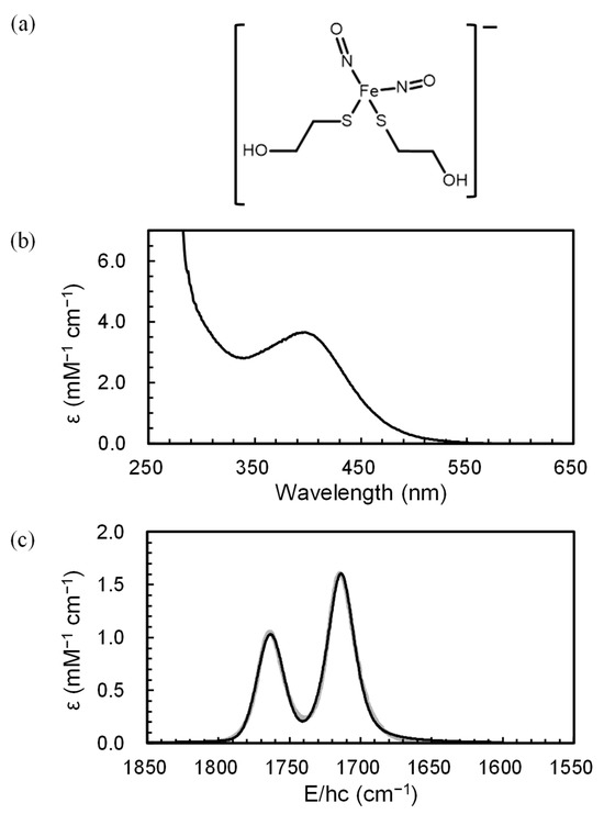 FeSO4(H2O)7 and 2-mercaptoethanol were purchased from Sigma-Aldrich (St. Louis, MO, USA). NO gas was purchased from PSG Dover (Oak Brook, IL, USA). To ensure the elimination of dissolved oxygen, all solutions were thoroughly deoxygenated by bubbling nitrogen gas through them. The NO gas was immediately purified before use by passing it through a 3-M NaOH solution, which effectively removed NO2 and N2O3 produced by reactions with O2 in the NO introduction line. A 60-mM solution of a mononuclear anionic DNIC with two 2-mercaptoethanol ligands, [(HOCH2CH2S)2Fe(NO)2]−, was synthesized by first dissolving an appropriate amount of FeSO4(H2O) in D2O. Excess purified NO was then injected into this solution, followed by the addition of a 10-fold equivalent of 2-mercaptoethanol to the NO-saturated Fe(II) solution. The pH of the resulting solution was adjusted to be basic (pD = 10.5) using a 10-M NaOH solution, and the solution was maintained in a NO-saturated state by further injecting the purified NO. The successful synthesis of the DNIC was checked by collecting electronic (UV-3100, Sinco, Seoul, Republic of Korea) and FTIR (Spectrum 3, Perkin Elmer, Shelton, CA, USA) spectra of the final product. The synthesis of DNIC was confirmed by identifying the characteristic peaks in the electronic and vibrational spectra [16,26,27,28,29,30], as illustrated in Figure 1. D2O was used to avoid the absorption of H2O away from the spectral region of interest.