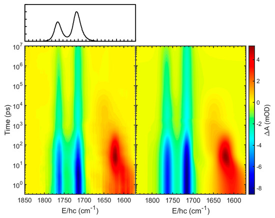 Two-dimensional contour map of the time-resolved infrared (TRIR) spectra of [Fe(NO)2(MerS)2]− in D2O at 293 K after excitation at 400 nm (left panel) and its fit (right panel) using four basis spectra shown in Figure 4a (see text). The equilibrium FT-IR spectrum is also shown above the left panel. The absorbance difference (ΔA) was obtained by subtracting the pre-photoexcitation absorbance from post-photoexcitation absorbance. Absorbance is reported in optical density (OD) units, where 1 mOD = 10−3 OD. The x-axis label is the wavenumber, represented by energy (E) divided by Planck’s constant (h) and the speed of light (c).