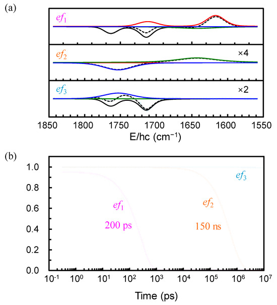 The TRIR spectra were collected after the excitation of [Fe(NO)2(MerS)2]− in D2O at 293 K using 400-nm pulse in the broad time range from 0.3 ps to 10 μs comprising the spectral region of 1850–1550 cm−1. This spectral region was selected because it allows one to focus on the characteristic NO stretching modes of the DNIC species, which appear without any interference from the solvent absorption bands. The 2D contour map of the TRIR spectra is shown in the left panel of Figure 2. The TRIR spectra exhibit immediate bleach (negative-going signal) at the positions of the equilibrium absorption bands of [Fe(NO)2(MerS)2]−, implying that the population of the ground state of [Fe(NO)2(MerS)2]− is depleted within 0.3 ps, the earliest time in the current experiment, due to the photoexcitation and/or photodissociation of the excited [Fe(NO)2(MerS)2]−. The immediate appearance of new absorption features in the region of 1680−1550 cm−1, which evolve with time, also indicates that the excited-state and/or new compounds appear within 0.3 ps after excitation and undergo further reaction. These new absorptions were initially much broad, then shifted to blue, and finally settled at 1712 and 1617 cm−1 with a time constant of 5.5 ps (vide infra). The narrowing and blue-shifting of the transient absorptions arises from the thermal relaxation of the initially hot species produced upon immediate relaxation of the excited species [25]. The 400-nm photon excites [Fe(NO)2(MerS)2]− to its metal-to-ligand charge transfer (MLCT) state [31]. This MLCT transition involves an electron transfer from the iron center to the NO ligands, resulting in a red-shift of the NO stretching frequencies due to increased electron density on the antibonding orbitals of the NO ligands. Therefore, both the new absorptions at 1712 and 1617 cm−1 were assigned to the NO stretching modes of [Fe(NO)2(MerS)2]− in the excited (MLCT) state, i.e., [Fe(NO)2(MerS)2]−*. [Fe(NO)2(MerS)2]−* appears to release excess energy thermally with a time constant of 5.5 ps before it undergoes photoreaction and/or electronic relaxation to the ground state. Initially, the TRIR spectra were analyzed using the singular value decomposition (SVD) to obtain the eigenfunctions involved in the TRIR spectra [32,33]. As shown in Figure 3, the TRIR spectra involve three eigenfunctions (ef1, ef2, and ef3). The eigenfunctions ef1 and ef2 decay with time constants of 200 ps and 150 ns, respectively, while ef3 maintains its magnitude up to 10 μs, the latest time in the current experiment. The positive features in the eigenfunctions of the SVD are related to the decaying spectra and the negative features to the growing spectra [33]. The TRIR spectra bleach because of the population depletion of the ground state of [Fe(NO)2(MerS)2]−; consequently, the inverted equilibrium spectrum should appear in the eigenfunctions when the ground-state population recovers. When the three eigenfunctions of SVD analysis are combined with the equilibrium spectrum and the calculated vibrational spectra for the expected compounds in the photochemical process of [Fe(NO)2(MerS)2]−, the basis spectra were found to fit the TRIR spectra [32]. Four basis spectra shown in Figure 4a, one of which is the equilibrium spectrum of [Fe(NO)2(MerS)2]−, were obtained to globally fit the TRIR spectra [32,33]. As shown in Figure 3a, the eigenfunctions of the SVD analysis can be described by the combination of the basis spectra of the TRIR spectra shown in Figure 4a. Specifically, the eigenfunction ef1 decaying with a time constant of 200 ps is a combination of three basis spectra: one basis spectrum with two absorption bands, one each at 1712 and 1617 cm−1, as a decaying basis spectrum (a positive feature); another with a broad absorption band at 1643 cm−1 as a growing basis spectrum (a negative feature); and the third is the equilibrium spectrum of [Fe(NO)2(MerS)2]− as a growing basis spectrum (a negative feature). The eigenfunction ef2 decaying with a time constant of 150 ns shows that the basis spectrum with an absorption band at 1753 cm−1 grows (a negative feature) while that with an absorption band at 1643 cm−1 decays (a positive feature). The eigenfunction ef3 is a combination of the basis spectrum with an absorption band at 1753 cm−1 (positive feature) and the equilibrium spectrum of [Fe(NO)2(MerS)2]− (negative feature). As shown in Figure 2 and Figure 5, the TRIR spectra were well reproduced by the sum of four basis spectra shown in Figure 4a.