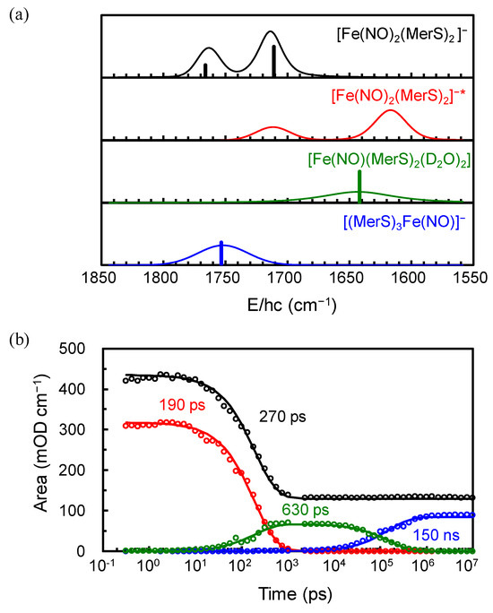 Among the four basis spectra, two have two absorption bands each with stronger absorption at the lower frequency, one of which is the equilibrium spectrum; the remaining two basis spectra have one absorption band each. The calculated vibrational spectra for various compounds expected from the photoexcitation of [Fe(NO)2(MerS)2]− reveal that compounds with two NO ligands (DNIC) have two absorption bands—one corresponding to the symmetric NO stretching mode and the other to the asymmetric NO stretching mode with stronger absorption in the asymmetric mode at the lower frequency. Compounds with one NO ligand, such as mononitrosyl iron complexes (MNICs), have one NO stretching mode. Therefore, the basis spectrum with two absorption bands is assigned to the DNIC and that with one absorption band to the MNIC.