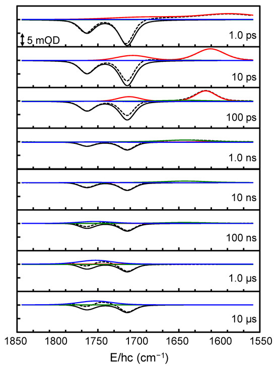 The details of the TRIR spectrometer have been previously described elsewhere [32,36,37,38,39,40]. In brief, a commercial Ti:sapphire oscillator/amplifier system (Spitfire Ace, Spectra Physics, Milpitas, CA, USA) generated 100-fs pulses at 800 nm with an energy of 700 μJ at a repetition rate of 2 kHz. A portion of these amplified pulses was directed to a home-built optical parametric amplifier (OPA) to produce near-IR signal and idler pulses. The near-IR pulses from the OPA were then difference frequency mixed in a 1-mm-thick, type-Ⅰ AgGaS2 crystal to yield tunable mid-IR probe pulses (120 fs, 160 cm−1 spectral width). The remaining 800-nm pulses were frequency doubled in a type-I, 0.6-mm-thick β-barium borate crystal, resulting in a 140-fs, 400-nm pulse with the energy of 10 μJ, a portion of which was used as the pump pulse to excite the sample. A translational stage was utilized to adjust the optical delay between the pump and the probe pulses, accommodating delays of up to 1 ns. As the optical delay provided by this method becomes impractically long and extends over a few nanoseconds, the femtosecond pump pulse was replaced with a commercial nanosecond tunable laser, operated by an optical parametric oscillator (NT240, EKSPLA, Vilnius, Lithuania) for longer delays of over 1 ns. Synchronization of the nanosecond pump pulse with the femtosecond mid-IR probe pulse was achieved using an electronic digital delay generator (DG535, Stanford Research Systems, Sunnyvale, CA, USA). The instrument response function was approximately 0.2 ps for the femtosecond pump pulse and 2.5 ns for the nanosecond pump pulse. To acquire the isotropic absorption spectrum, the polarization of the pump pulse was oriented at the magic angle (54.7°) relative to the probe pulse. To mitigate nonlinear effects associated with a high pump intensity, the pump pulse energy was set at approximately 2 μJ, with a beam diameter of 230 μm. The mid-IR probe pulse with the energy of ~10 nJ and a beam diameter of 200 μm passed through the sample excited by the 400-nm pump pulse. The resultant mid-IR pulse, containing sample information, was dispersed using a 320-mm IR monochromator (IHR320, Horiba, Piscataway, NJ, USA) equipped with a 150 L/mm grating and a N2(l)-cooled 1 × 128 HgCdTe array detector (Infrared Associates, Stuart, FL, USA), achieving a spectral resolution of ~1.3 cm−1/pixel at 1760 cm−1. The probe pulse was centered at 1760, 1720, 1680, or 1630 cm−1 to facilitate probing over a broader spectral region than that afforded by the 160-cm−1 spectral width of the pulse.