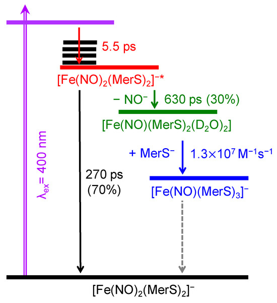Schematics for the photoexcitation dynamics of [Fe(NO)2(MerS)2]− in D2O at 293 K after excitation at 400 nm.