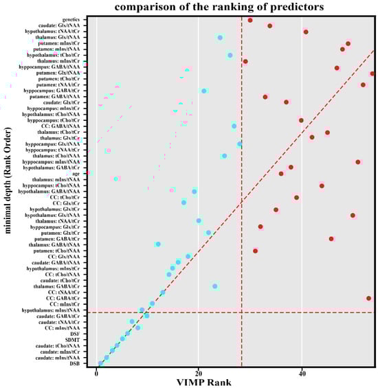 Comparison of the ranking of predictors by graph depth on the y-axis and by VIMP on the x-axis. The horizontal dashed line represents the cutoff for significance within the graph depth. The predictors below the cutoff are considered necessary according to graph depth. Similarly, the vertical dashed line is for cutoff on VIMP. VIMP = variable importance; Backward = Digit Span Backward; caudate_mIns.tNAA = Caudate Nucleus Myoinositol/tN-Acetyl Aspartate; caudate_mIns.tCr = in Caudate Nucleus Myoinositol/t-Creatine; caudate_tCho.tNAA = Caudate Nucleus tCholin/tN-Acetyl Aspartate; SDMT = Single Digit Modality Test; forward = Digit Span Forward; corpus callosum_mIns.tNAA = Corpus Callosum Cyoinositol/tN-acetyl aspartate; caudate_tNAA.tCr = Caudate Nucleus tN-Acetyl Aspartate/tCreatine; caudate_GABA.tCr = Caudate Nucleus γ-Aminobutyric acid/tCreatine.